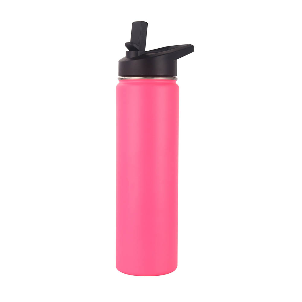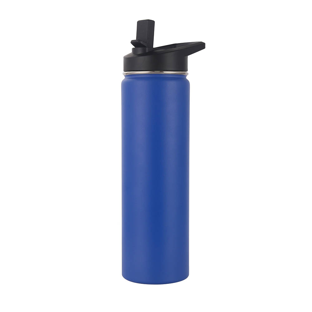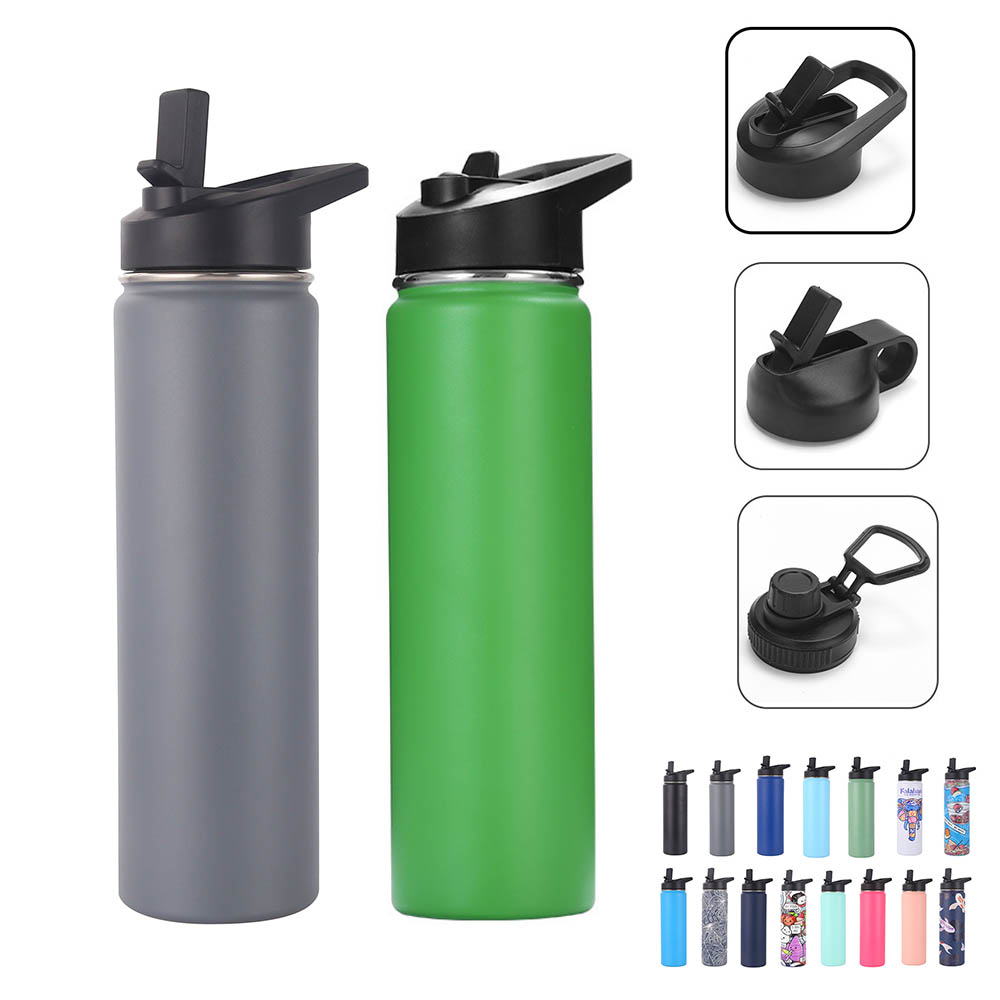 This 25 oz vacuum insulated water bottle features with a screw on flip-top straw lid and an easy carry loop handle, made from double wall food grade stainless steel material with powder-coated finish. It keeps beverages hot for up to 12 hours and cold for up to 24 hours, great for the gym, school, or outdoor adventures. Get either the standard permanent laser engraved imprint or an optional full color imprint, our list price is based on laser engraved or 1 color imprint. We provide multiple different lid option, welcome to inquiry us!